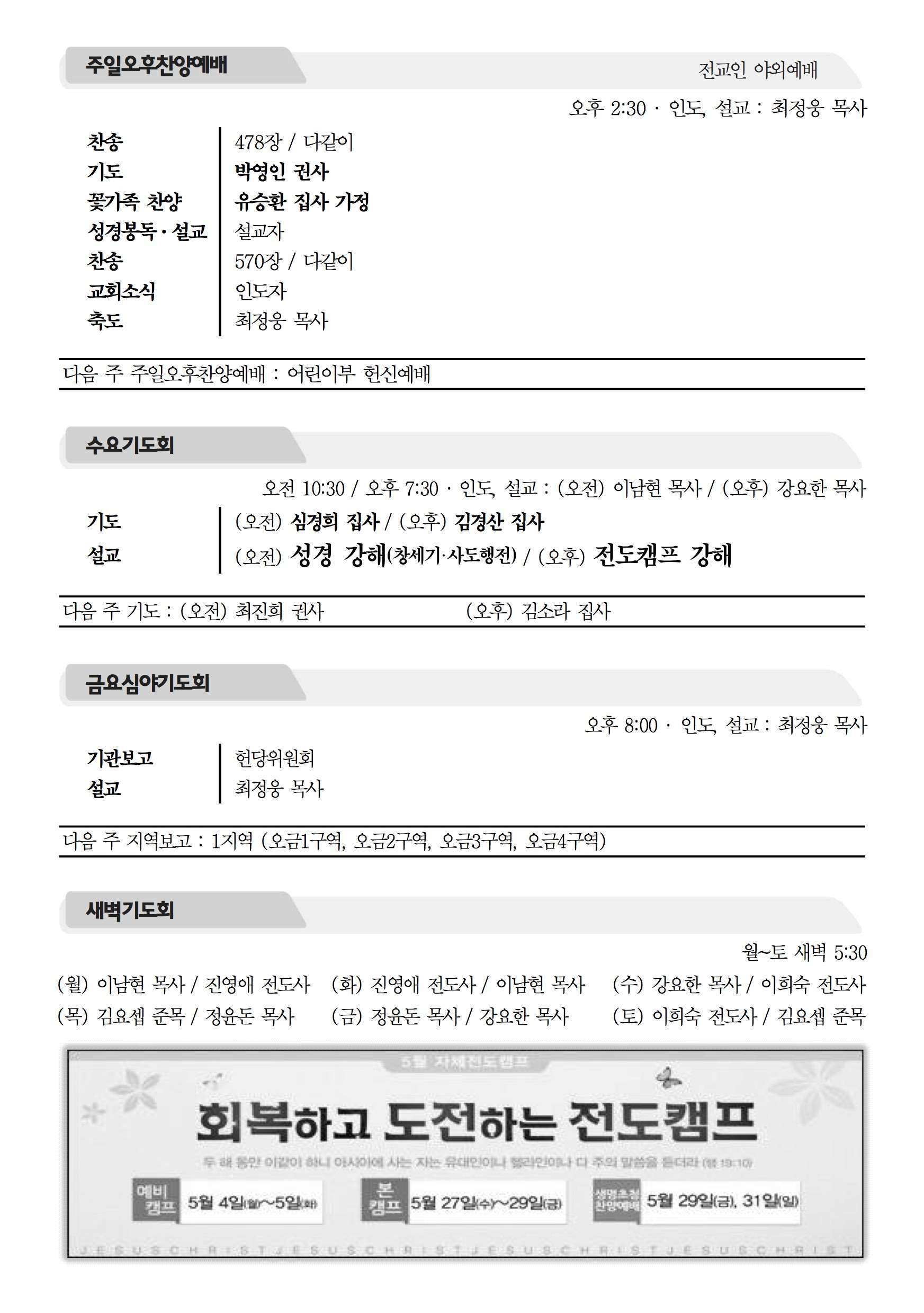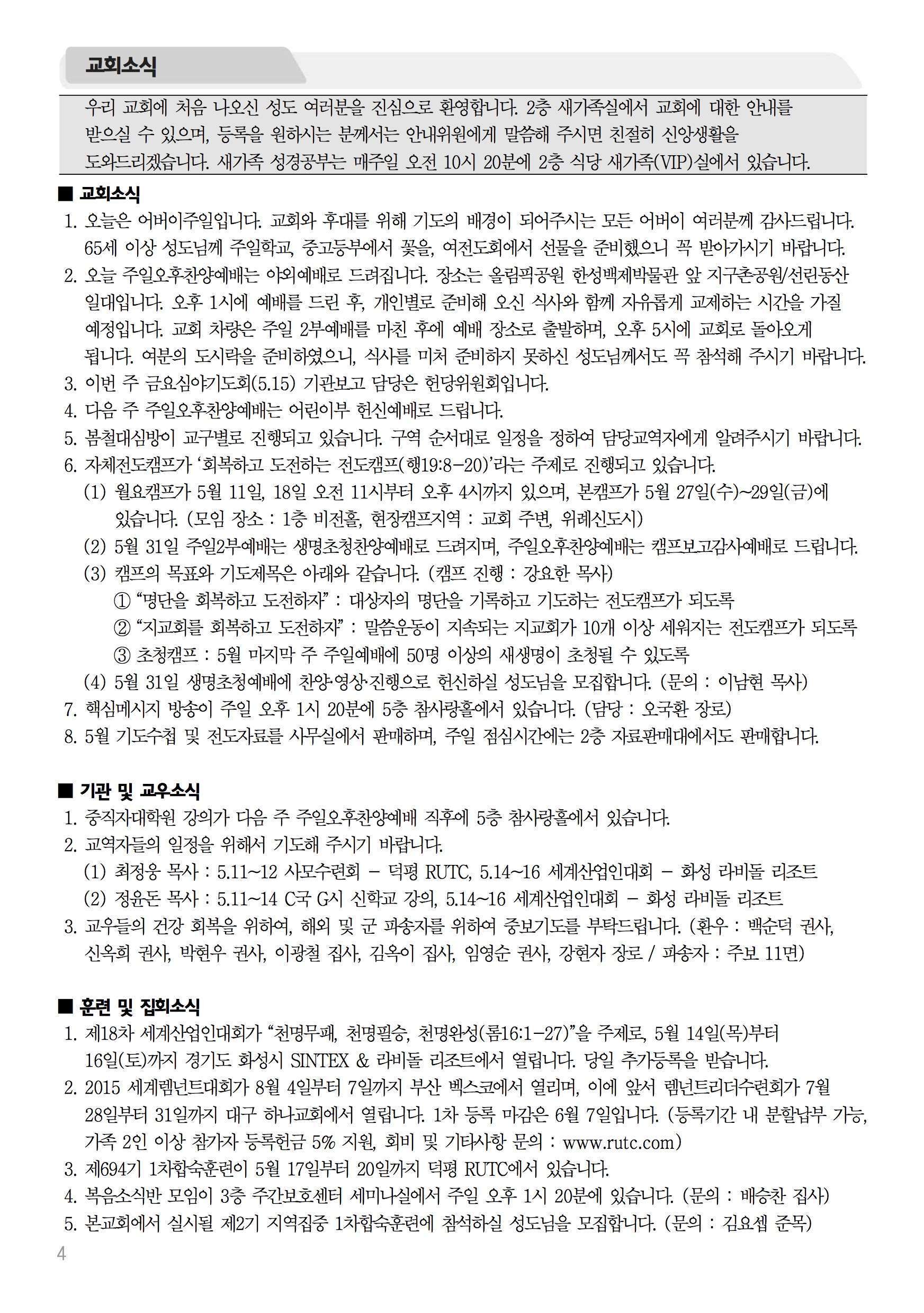2015년 5월 10일 주보 2015년 5월 10일 주보 말씀을 위한 집중(대하17:1-9) 마음에 기록해야 할 새 언약(출19:1-6, 히8:1-13) 2015년 5월 10일 주보 Posted on 2015년 5월 9일 in 주보 제 48권 19호 2015년 5월 10일 주보 주보 보기(PDF) Share this article: About truelove Related Articles 2017년 12월 17일 주보 2020년 2월 2일 주보 2021년 9월 12일 주보 2017년 8월 20일 주보