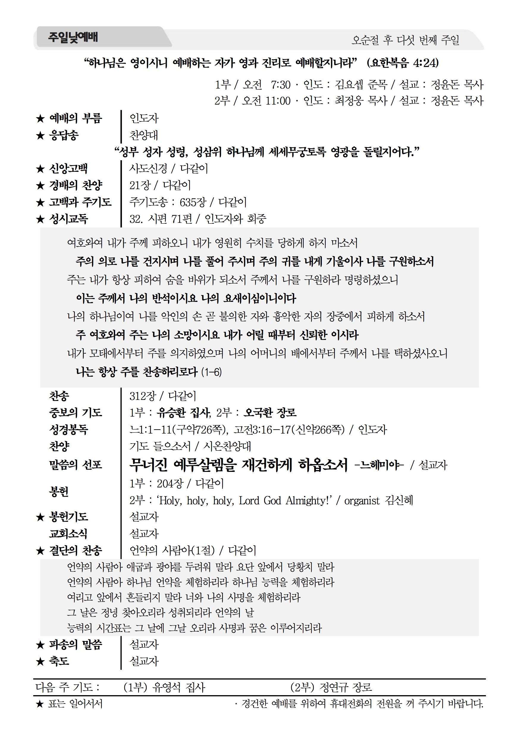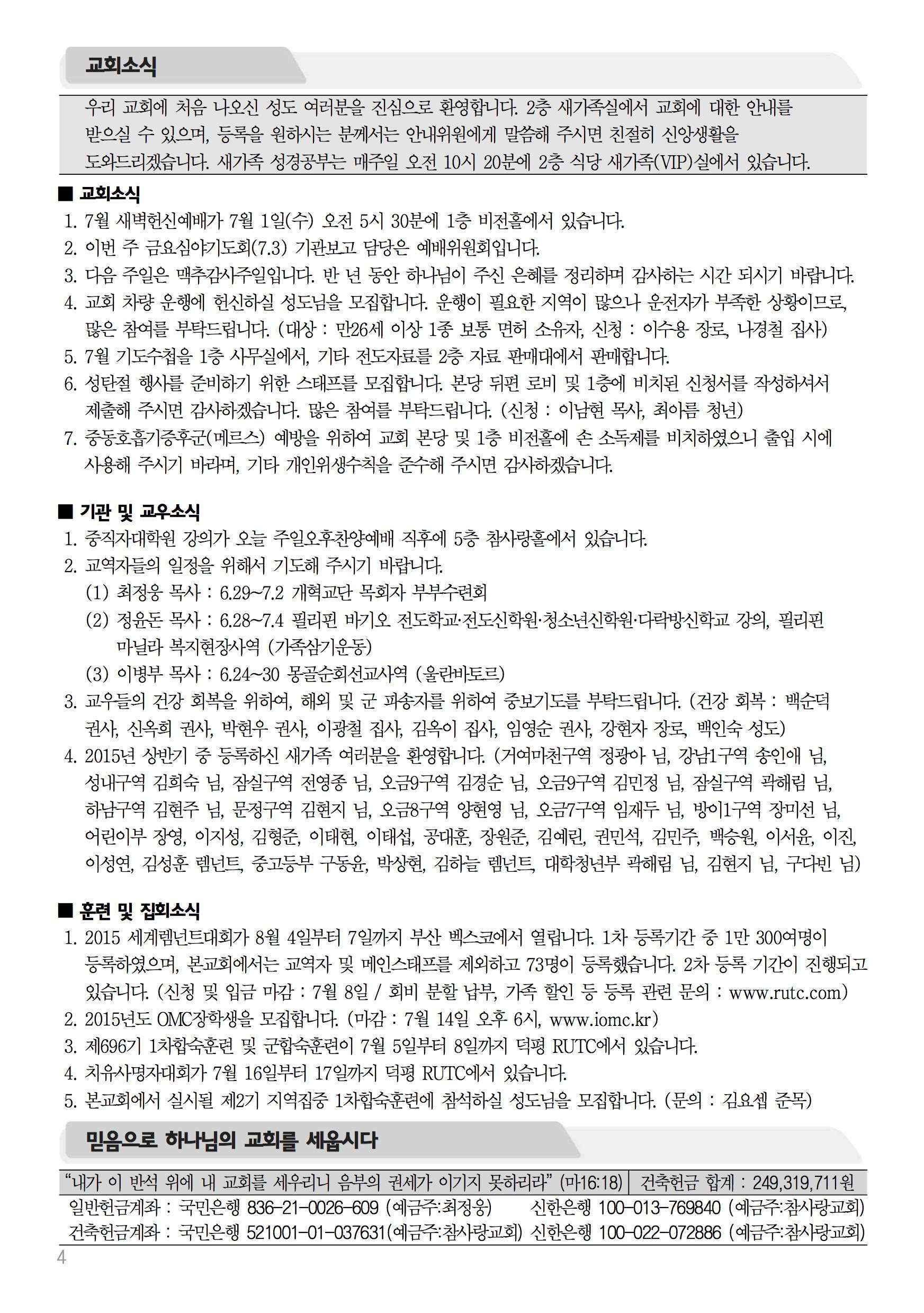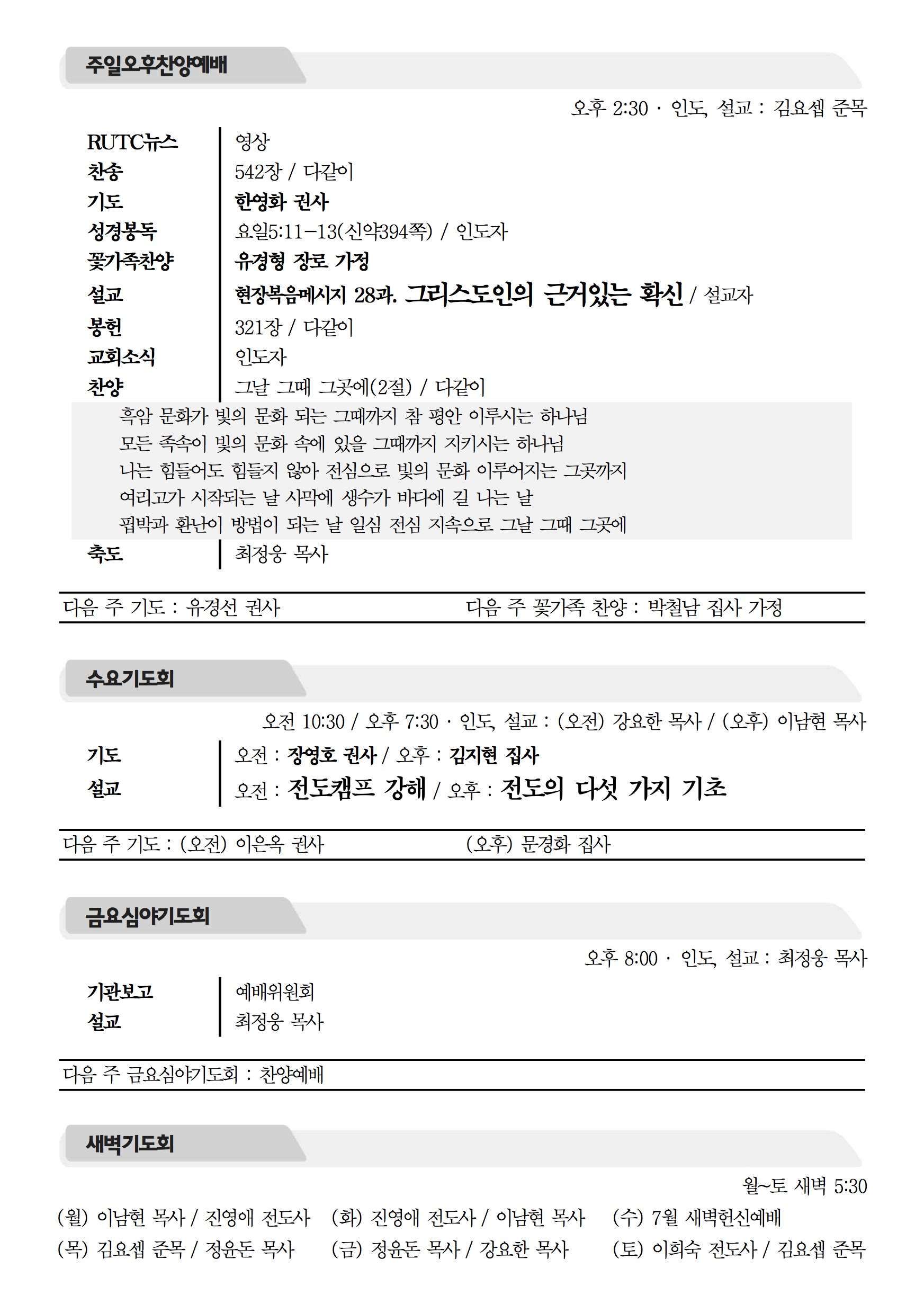 2015년 6월 28일 주보 2015년 6월 28일 주보 세상이 감당치 못하는 렘넌트(히11:38-40) 천명을 체험하는 믿음의 사람(시91:1-16, 히11:32-40) 2015년 6월 28일 주보 Posted on 2015년 6월 27일 in 주보 제 48권 26호 2015년 6월28일 주보 주보 보기(PDF) Share this article: About truelove Related Articles 2019년 12월 22일 주보 2019년 5월 12일 주보 2023년 12월 17일 주보 2024년 11월 3일 주보