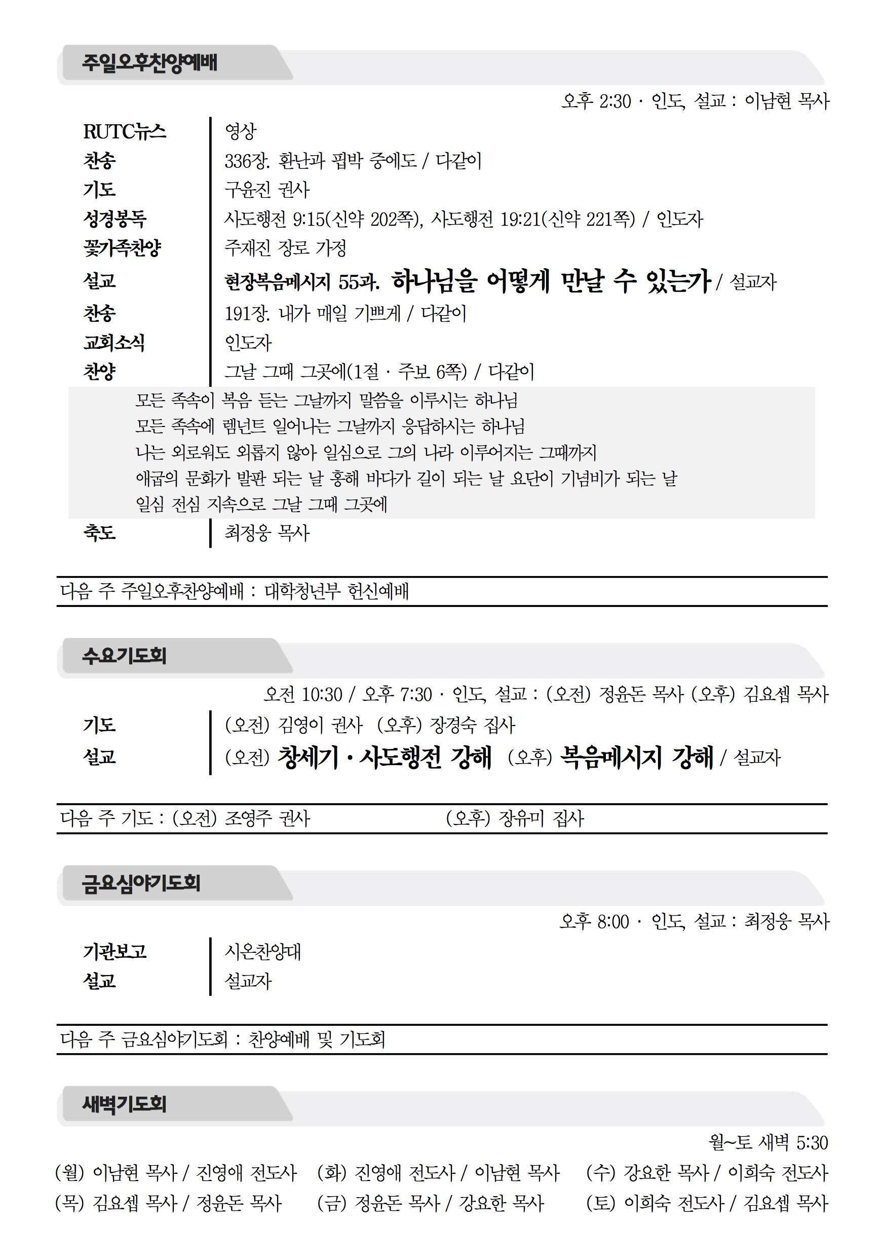 2016년 6월 12일 주보 2016년 6월 12일 주보 언약의 중심을 가진 자(막2:1-12) 오래된 것을 치유하는 복음의 능력(사43:18-19, 막2:1-12) 2016년 6월 12일 주보 Posted on 2016년 6월 10일 in 주보 제 49권 24호 2016년 6월 12일 주보 주보 보기(PDF) Share this article: About truelove Related Articles 2024년 12월 29일 주보 2018년 10월 28일 주보 2017년 5월 7일 주보 2017년 7월 30일 주보
