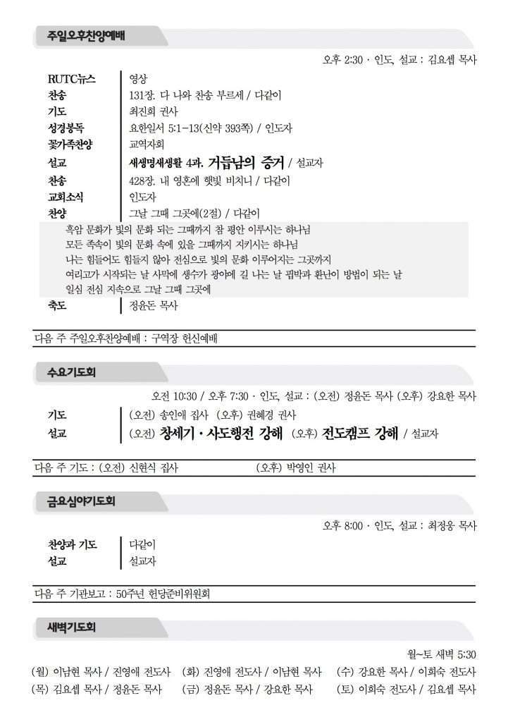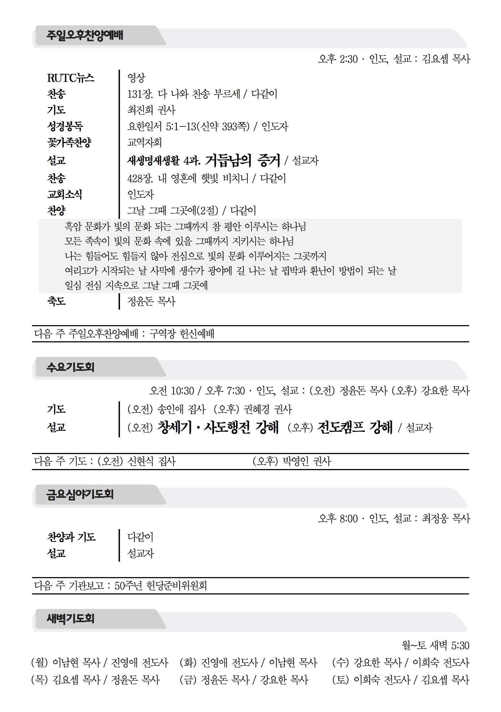 2017년 1월 8일 주보 2017년 1월 8일 주보 그리스도 체험(막14:22-26) 삶으로 체험해야 할 복음(시39:7-9, 막14:22-26) 2017년 1월 8일 주보 Posted on 2017년 1월 6일 in 주보 제 50권 2호 2017년 1월 8일 주보 주보 보기(PDF) Share this article: About truelove Related Articles 2024년 6월 16일 주보 2021년 1월 10일 주보 2025년 4월 27일 주보 2024년 7월 21일 주보