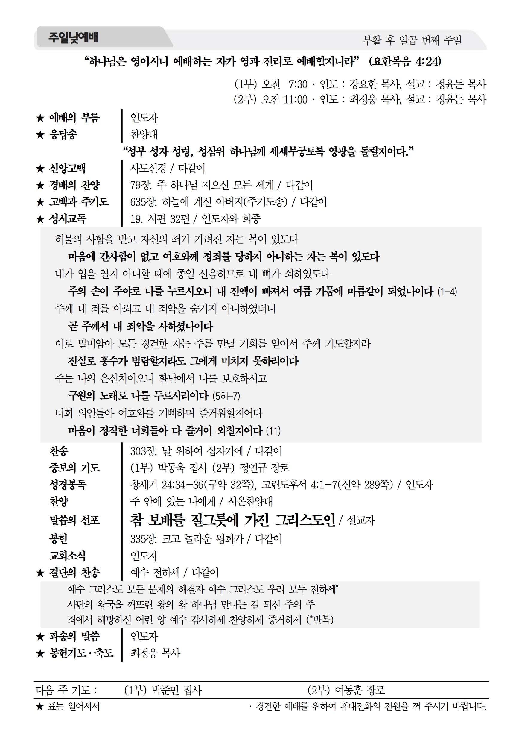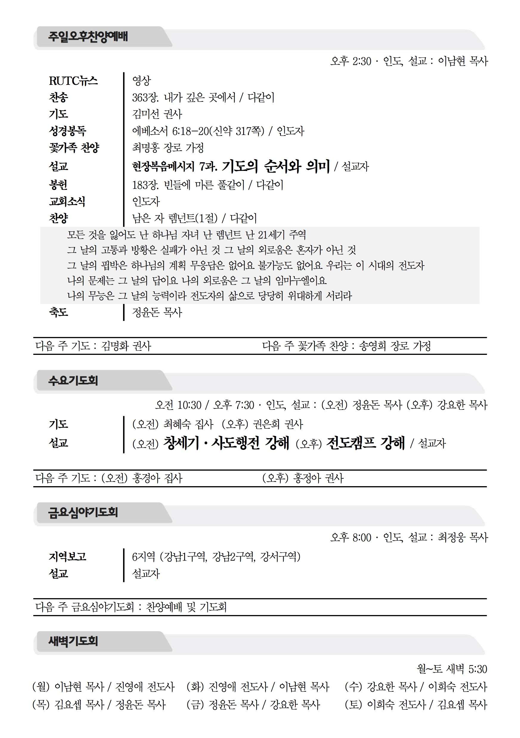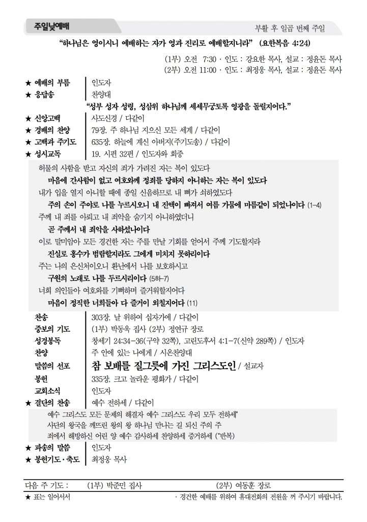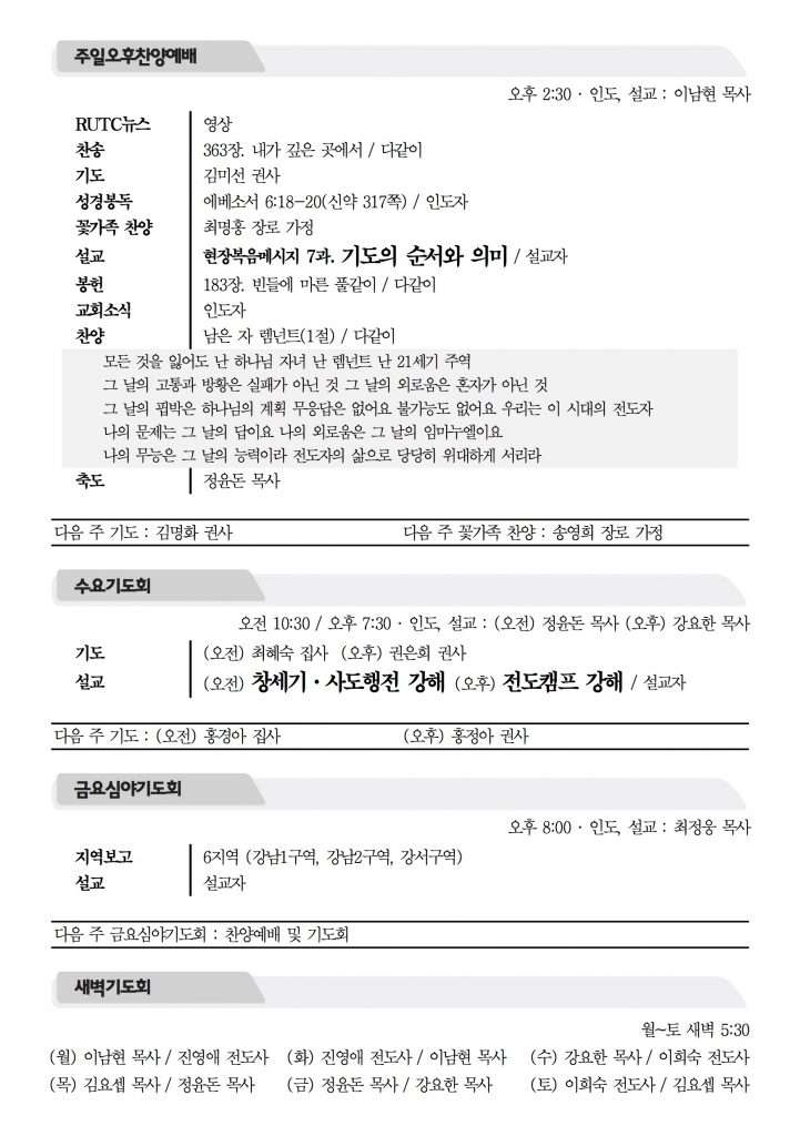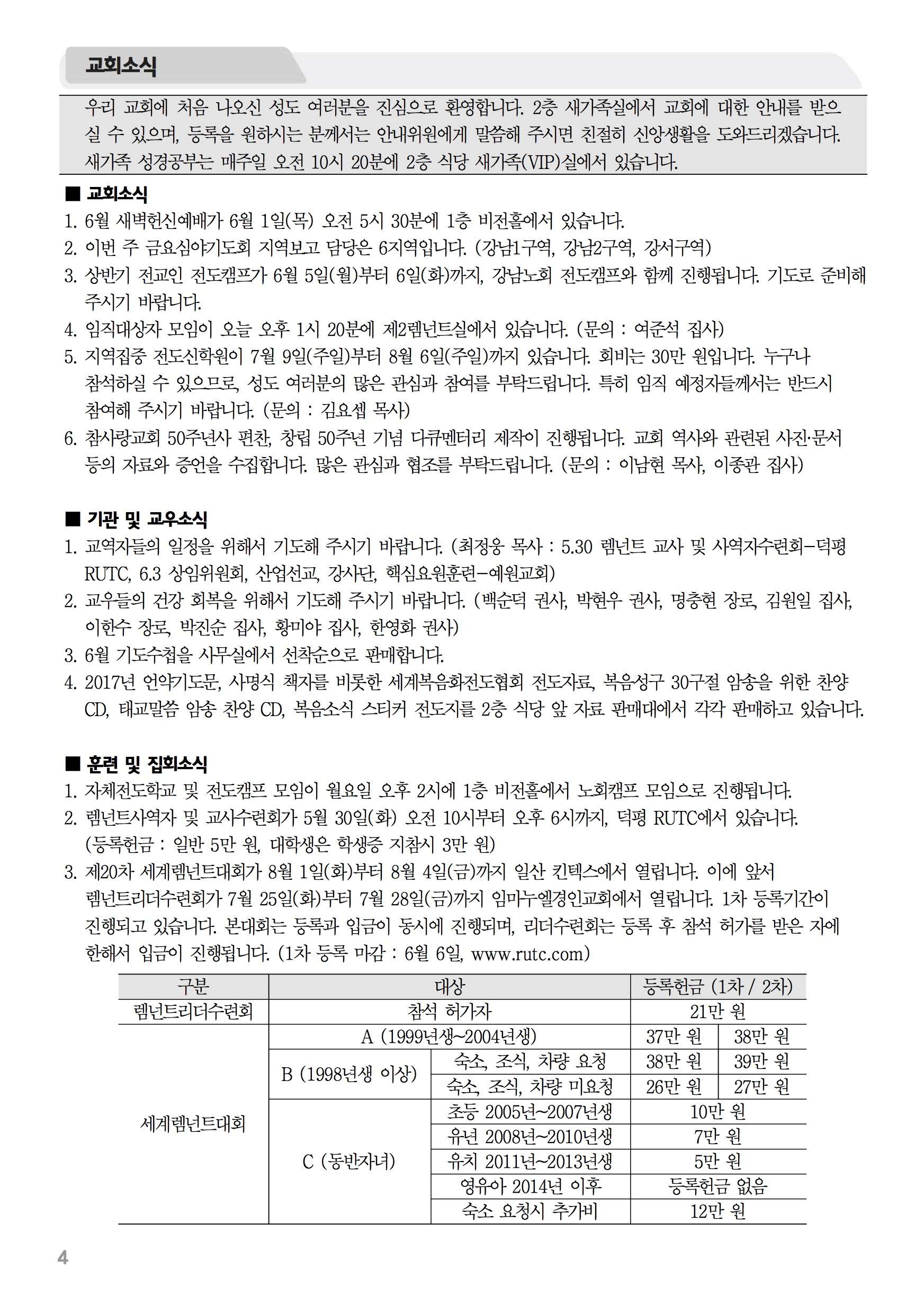 2017년 5월 28일 주보 2017년 5월 28일 주보 참된 기도(삼상1:1-20) 시대 흐름을 바꾼 한 여인의 기도(삼상1:10-20, 눅1:5-20) 2017년 5월 28일 주보 Posted on 2017년 5월 27일 in 주보 제 50권 22호 2017년 5월 28일 주보 주보 보기(PDF) Share this article: About truelove Related Articles 2019년 11월 3일 주보 2023년 11월 5일 주보 2015년 5월 3일 주보 2017년 5월 21일 주보