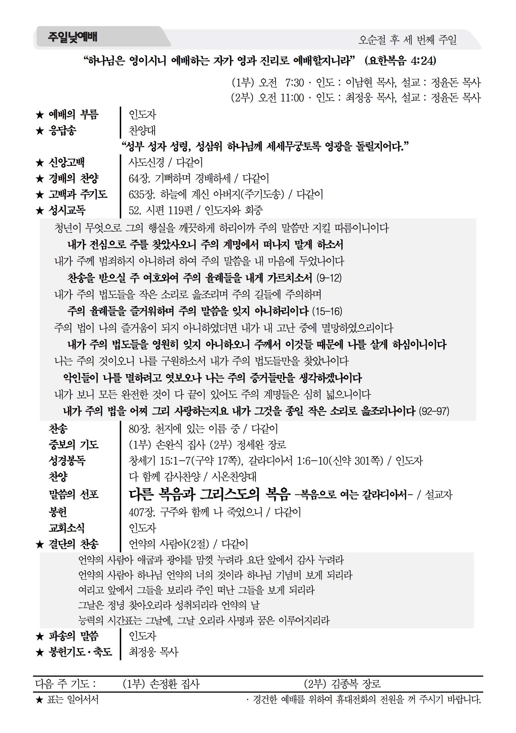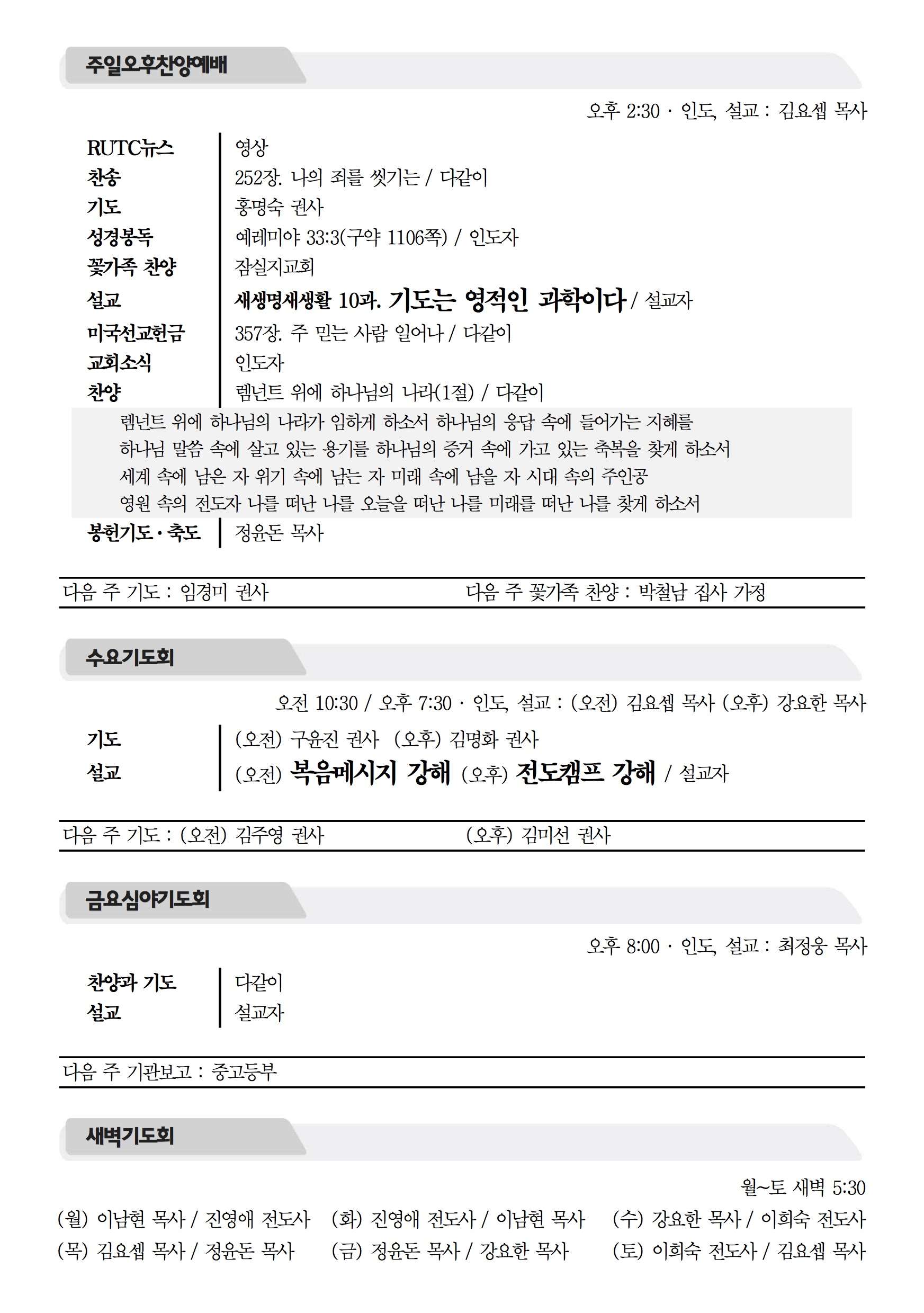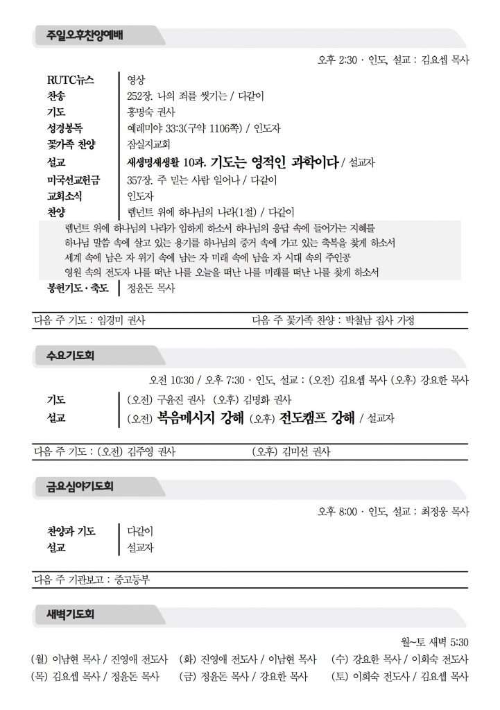2017년 6월 25일 주보 2017년 6월 25일 주보 렘넌트여 일어나라(왕상 19:1-21) 남겨두신 희망(왕상19:13-21, 롬11:1-5) 2017년 6월 25일 주보 Posted on 2017년 6월 24일 in 주보 제 50권 26호 2017년 6월 25일 주보 주보 보기(PDF) Share this article: About truelove Related Articles 2024년 4월 21일 주보 2026년 1월 18일 주보 2025년 8월 10일 주보 2023년 12월 24일 주보
