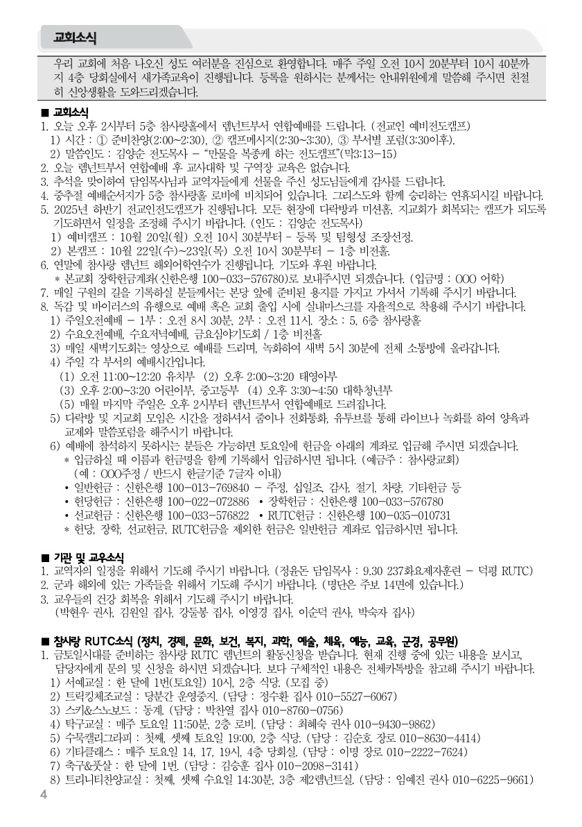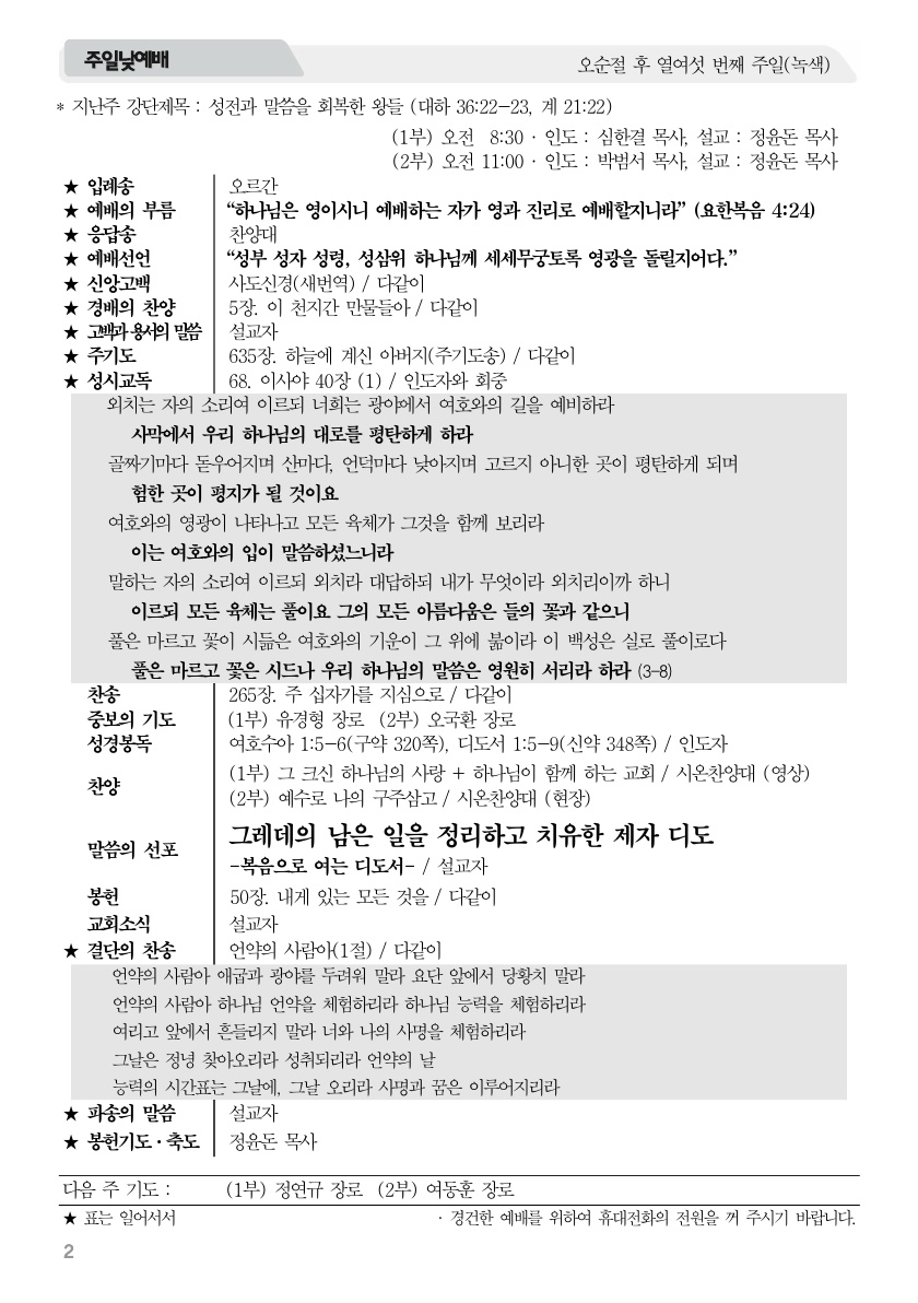 2025년 9월 28일 주보 2025년 9월 28일 주보 예수로 나의 구주 삼고 성전과 말씀을 회복한 왕들(대하36:22-23, 계21:22) 2025년 9월 28일 주보 Posted on 2025년 9월 27일 in 주보 제 58권 39호 2025년 9월 28일 주보 주보 보기(PDF) Share this article: About truelove Related Articles 2017년 8월 13일 주보 2024년 2월 11일 주보 2020년 10월 25일 주보 2019년 6월 2일 주보