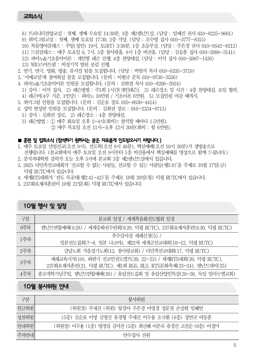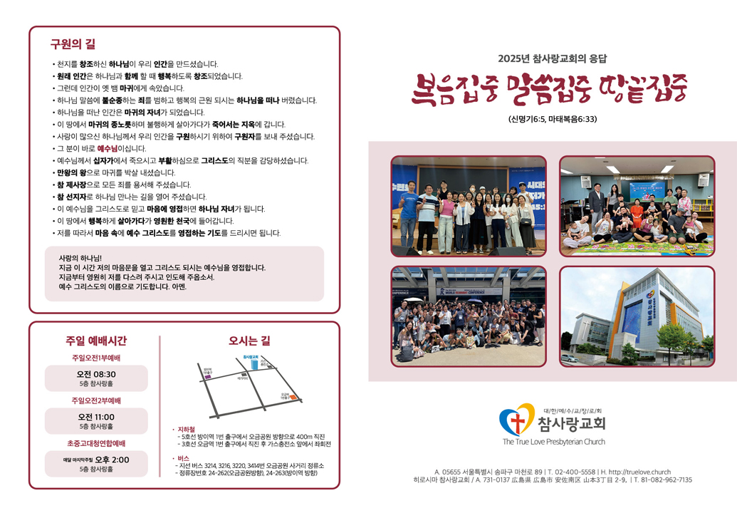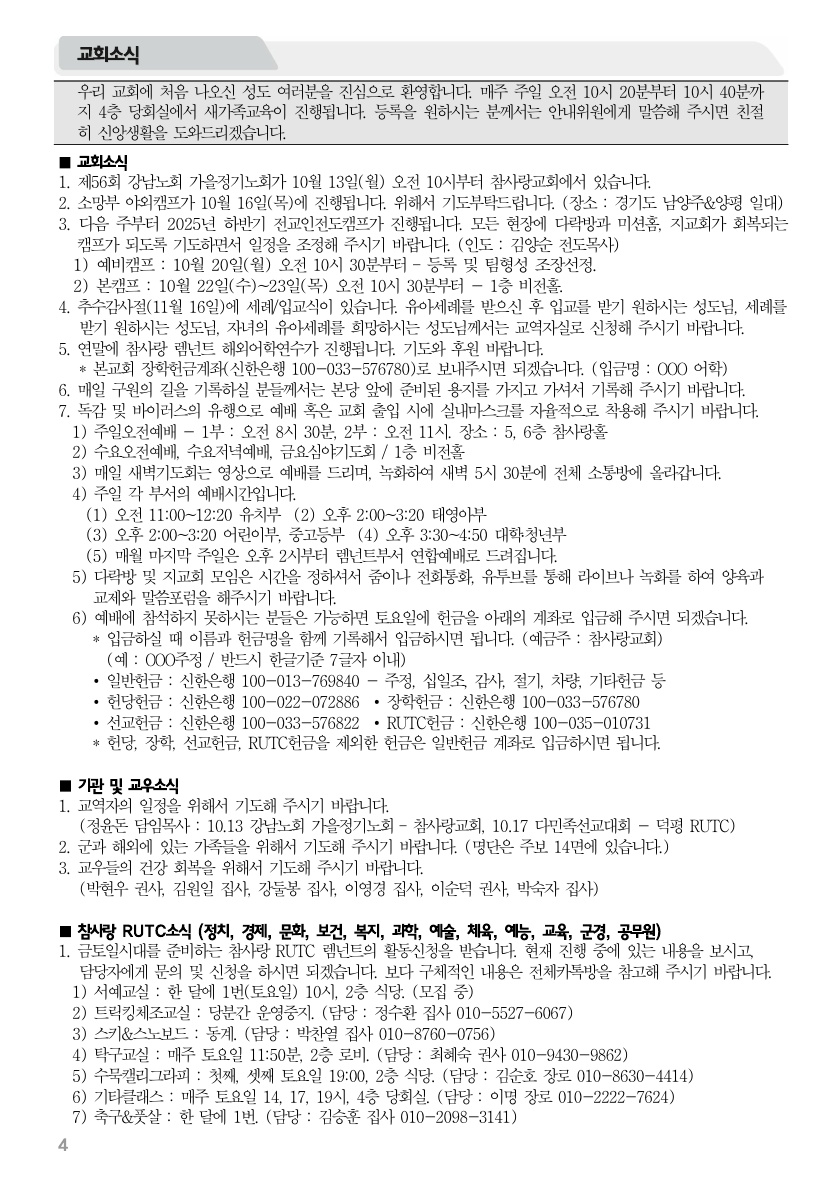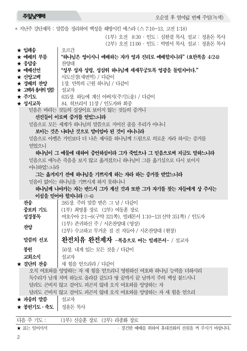 2025년 10월 12일 주보 2025년 10월 12일 주보 수고하고 무거운 짐 진 자들아 말씀을 정리하여 백성을 해방시킨 에스라(스7:10-13, 고전1:18) 2025년 10월 12일 주보 Posted on 2025년 10월 11일 in 주보 제 58권 41호 2025년 10월 12일 주보 주보 보기(PDF) Share this article: About truelove Related Articles 2020년 3월 8일 주보 2021년 6월 27일 주보 2025년 6월 8일 주보 2021년 9월 5일 주보