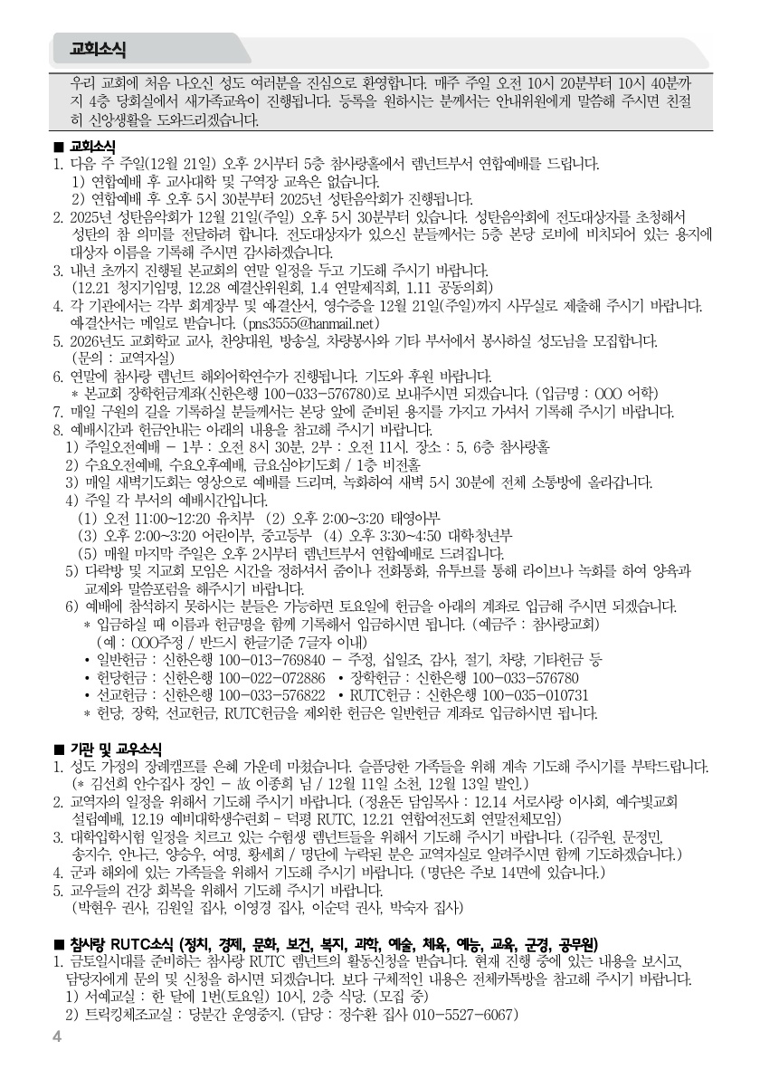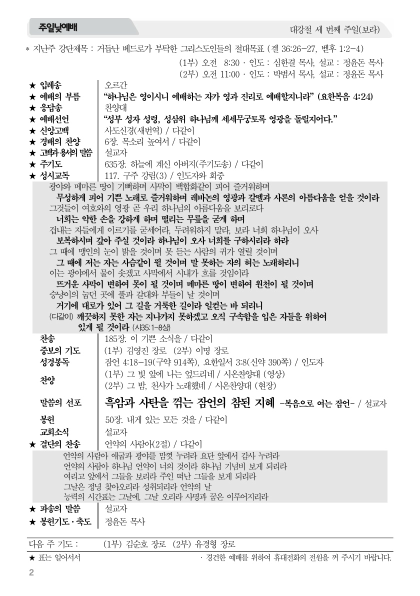 2025년 12월 14일 주보 2025년 12월 14일 주보 그 밤, 천사가 노래했네 거듭난 베드로가 부탁한 그리스도인들의 절대목표(겔36:26-27, 벧후1:2-4) 2025년 12월 14일 주보 Posted on 2025년 12월 13일 in 주보 제 58권 49호 2025년 12월 7일 주보 주보 보기(PDF) Share this article: About truelove Related Articles 2023년 1월 1일 주보 2017년 3월 26일 주보 2019년 6월 30일 주보 2017년 8월 20일 주보