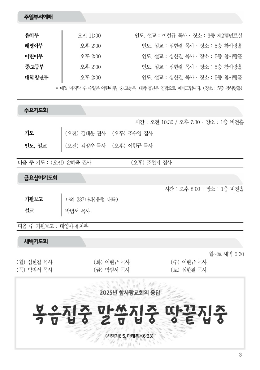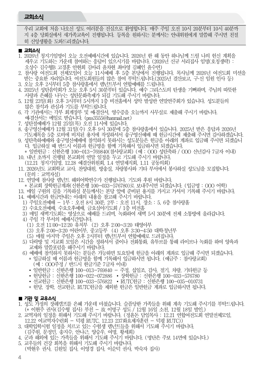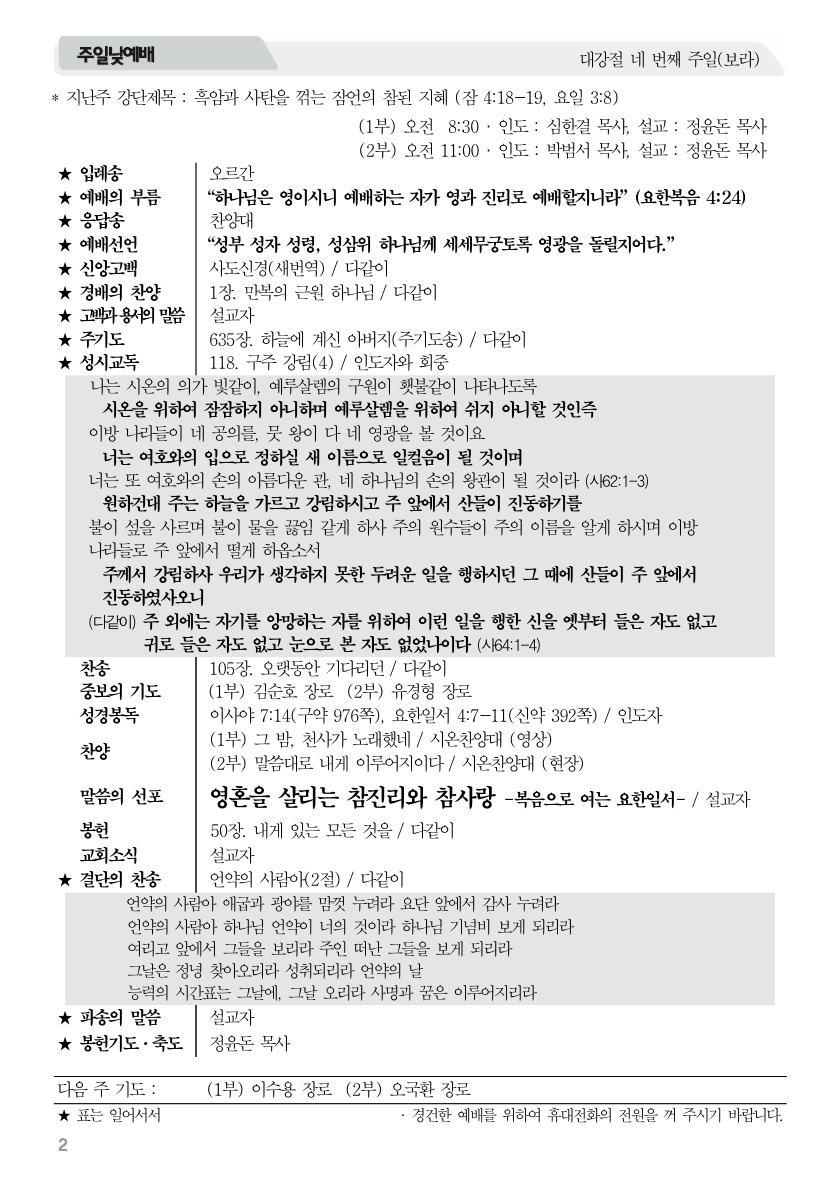 2025년 12월 21일 주보 2025년 12월 21일 주보 말씀대로 내게 이루어지이다 흑암과 사탄을 꺾는 잠언의 참된 지혜(잠4:18-19, 요일3:8) 2025년 12월 21일 주보 Posted on 2025년 12월 20일 in 주보 제 58권 51호 2025년 12월 21일 주보 주보 보기(PDF) Share this article: About truelove Related Articles 2020년 5월 3일 주보 2020년 1월 12일 주보 2016년 3월 27일 주보 2022년 3월 6일 주보