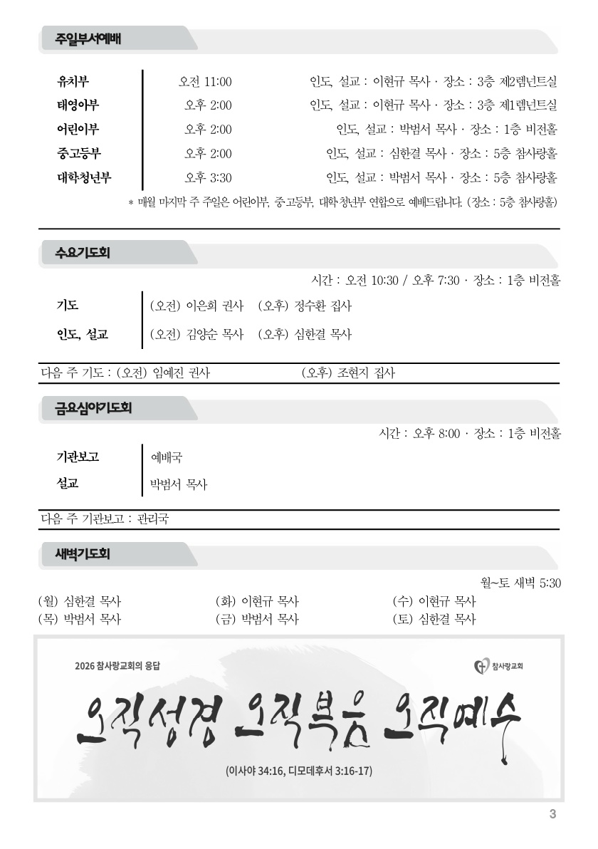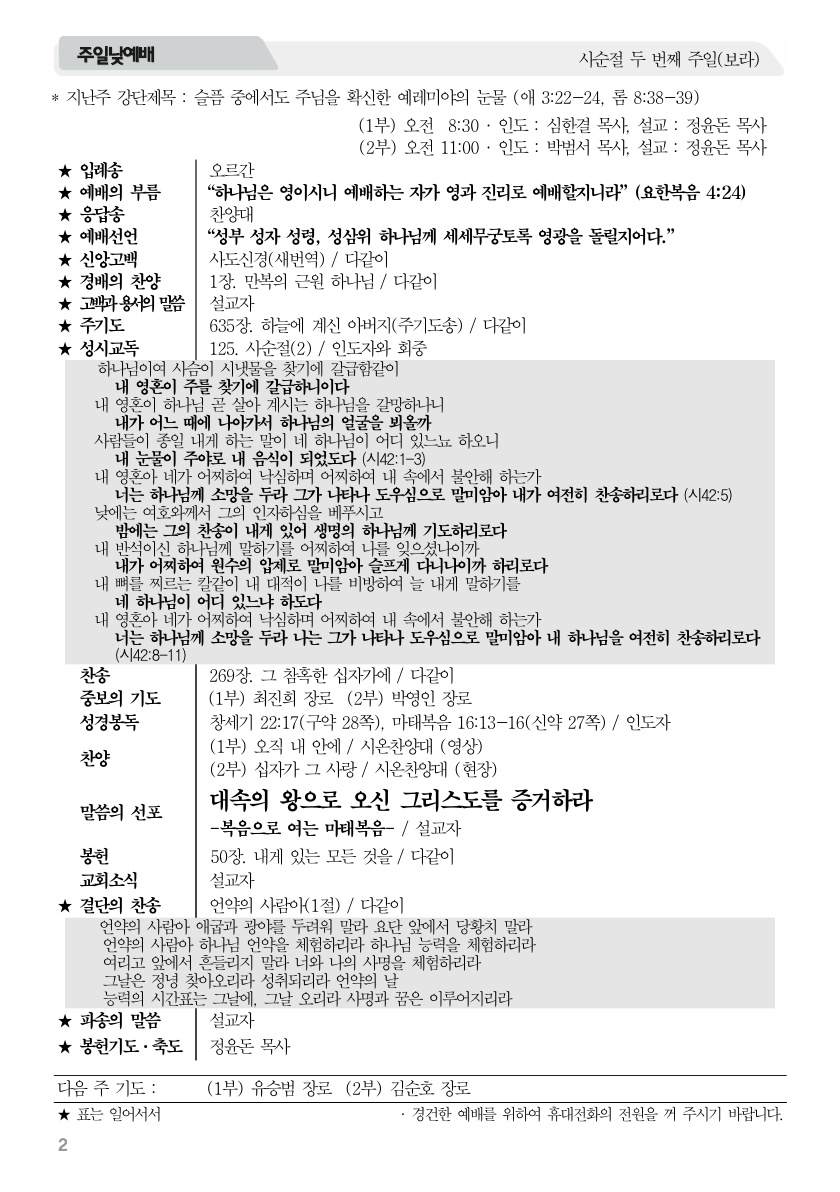 2026년 3월 1일 주보 2026년 3월 1일 주보 슬픔 중에서도 주님을 확신한 예레미야의 눈물(애3:22-24, 롬8:38-39) 2026년 3월 1일 주보 Posted on 2026년 2월 28일 in 주보 제 59권 9호 2025년 3월 1일 주보 주보 보기(PDF) Share this article: About truelove Related Articles 2024년 5월 26일 주보 2015년 5월 10일 주보 2022년 11월 27일 주보 2024년 7월 14일 주보