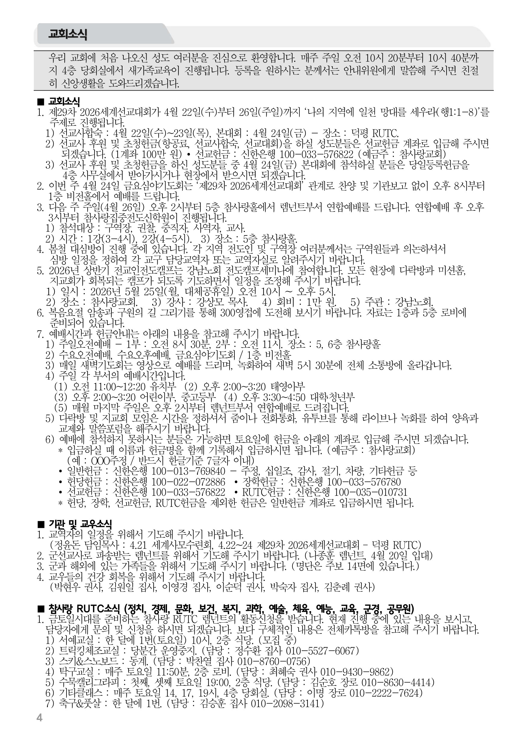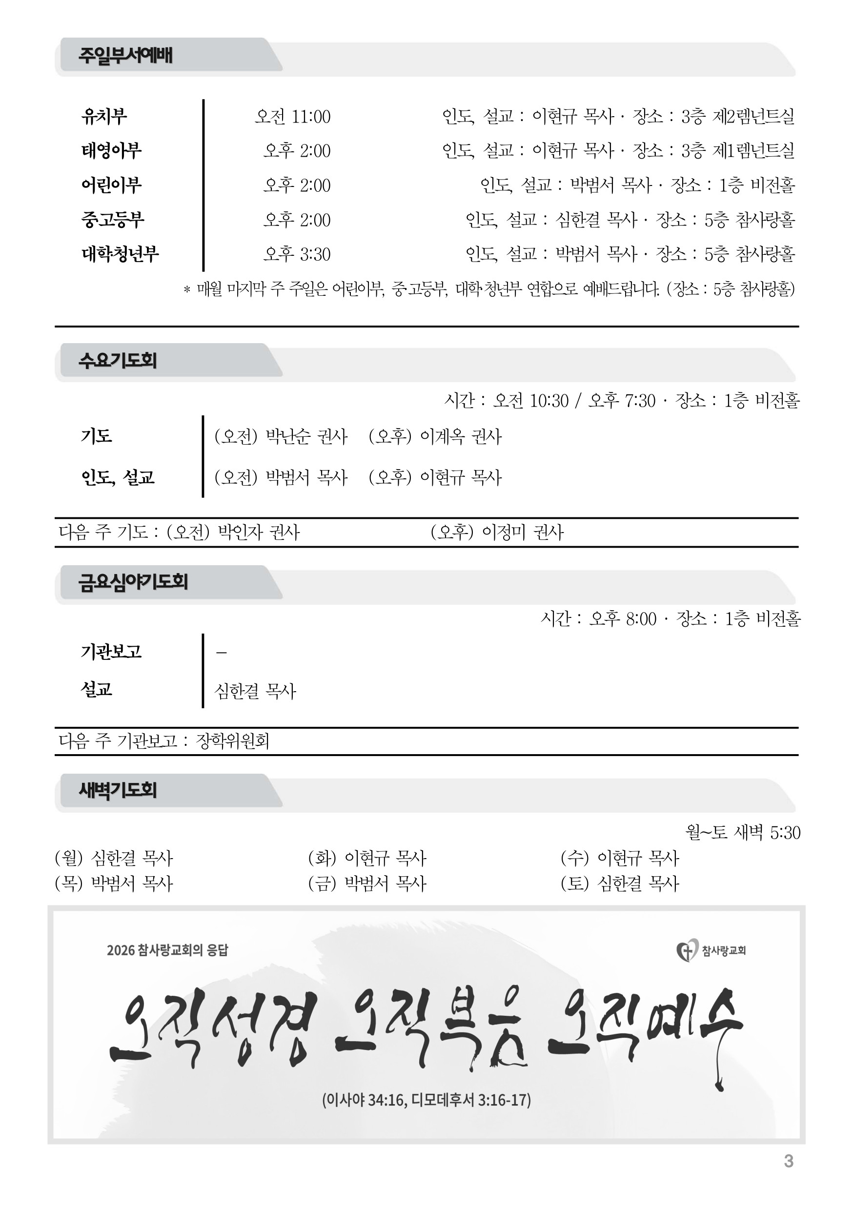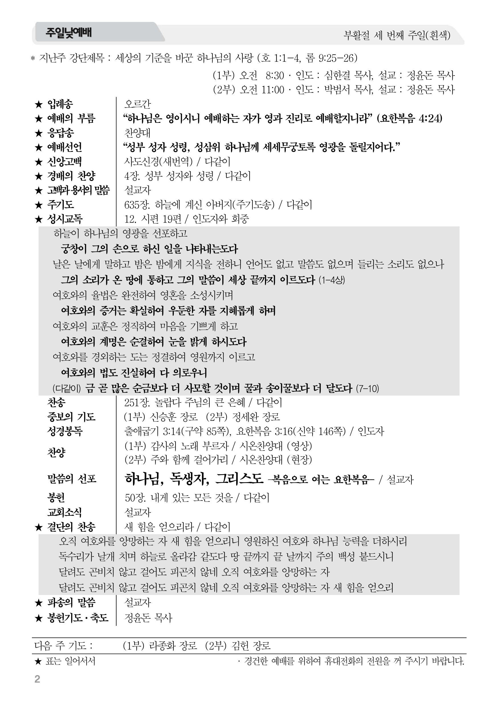 2026년 4월 19일 주보 2026년 4월 19일 주보 세상의 기준을 바꾼 하나님의 사랑(호1:1-4, 롬9:25-26) 2026년 4월 19일 주보 Posted on 2026년 4월 18일 in 주보 제 59권 16호 2026년 4월 19일 주보 주보 보기(PDF) Share this article: About truelove Related Articles 2017년 6월 18일 주보 2024년 1월 14일 주보 2019년 2월 3일 주보 2015년 4월 26일 주보